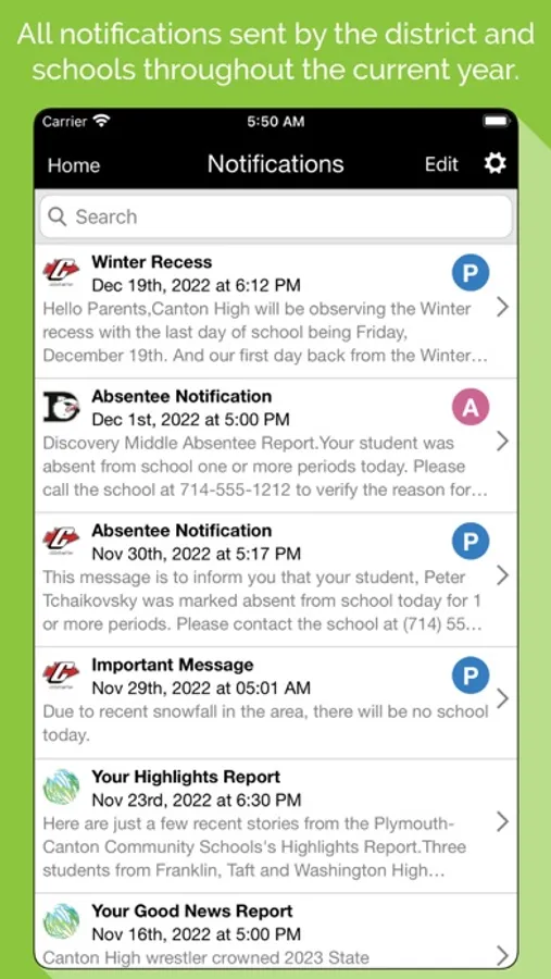 With the Plymouth-Canton CS app, you will never miss another important notification from a school or the district. You will have access to a complete list of every private notification and public information announcement ever sent during the school year. You can also choose to receive immediate alerts on your mobile device for new district and school notifications such as emergency situations, school closures, absenteeism and other important school announcements.