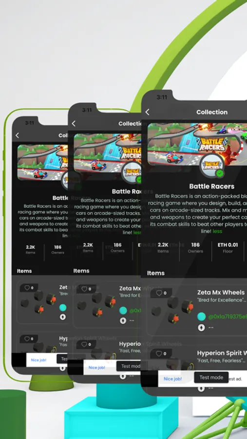 Bundles NFTs → view some of the NFT Bundles displayed with Card View you can swipe Left or Right to view the NFTs within that Bundle