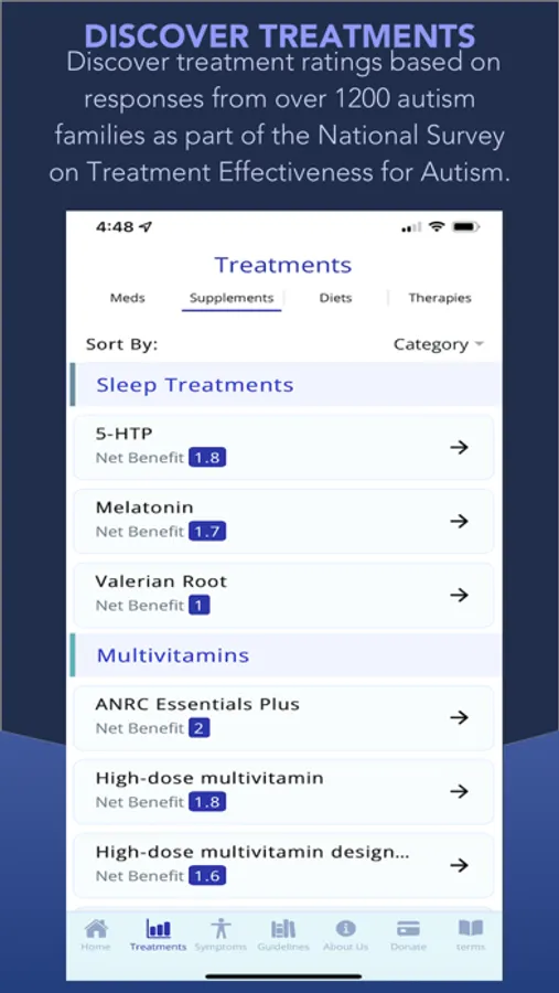 Guideline: The information provided by the Autism Nutrition Research Center on the ANRC app is intended to be used as an informational and educational resource. This content is not meant to substitute a medical professional's advice or act to diagnose or treat an illness or medical condition. Users should seek the advice of their qualified medical physician before making medical decisions. The ratings are from the National Survey on Treatment Effectiveness for Autism, and the Autism Nutrition Research Center cannot guarantee the accuracy of the information included. The Autism Nutrition Research Center strives for the accuracy of the provided information and will update information on an as-needed basis. The Autism Nutrition Research Center does not take responsibility for any decisions taken by users of the ANRC app.