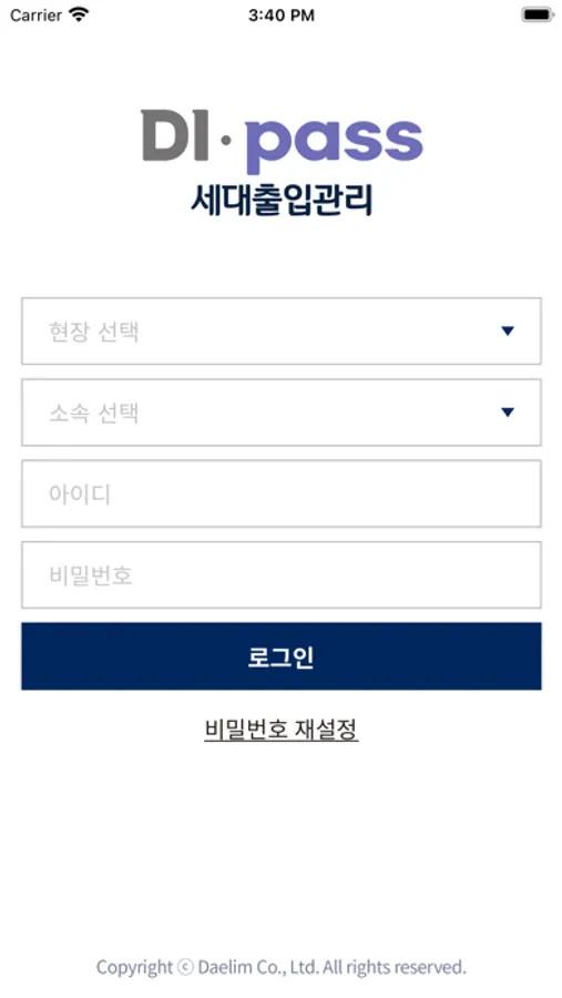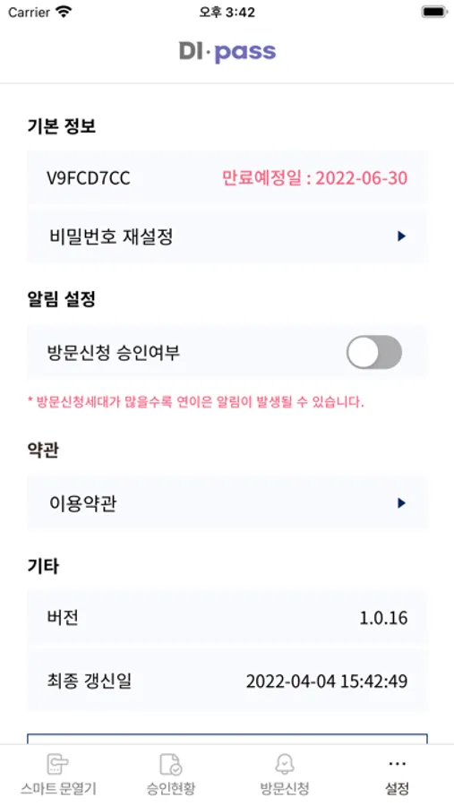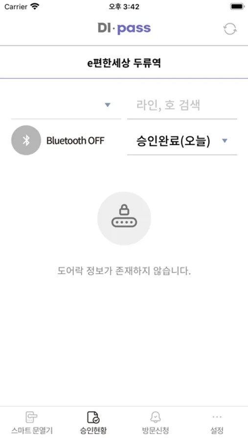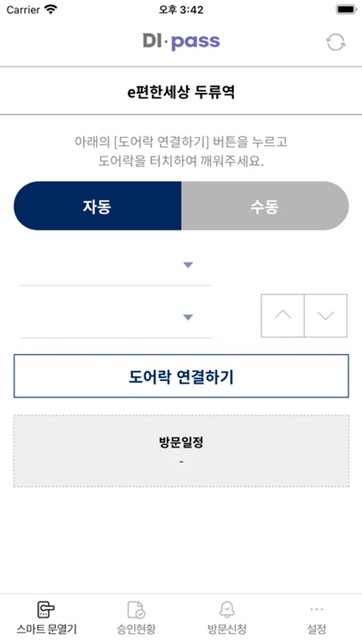 DI pass는 아파트의 시공 중 도어락의 비밀번호 없이 문열기가 가능한 세대 출입용 APP입니다.