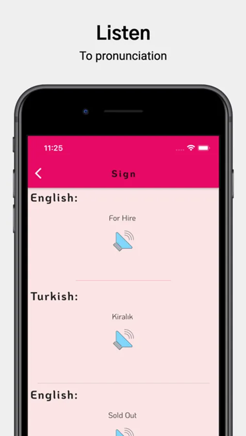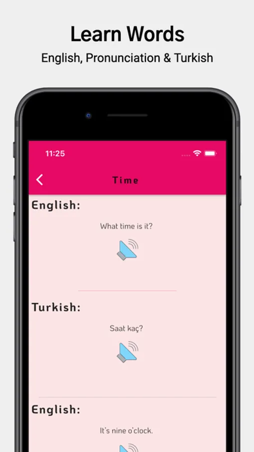• In every lesson, you can listen to the Turkish word pronunciation as well as see Turkish word in english language.