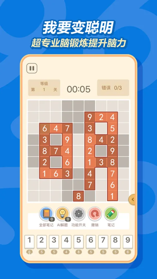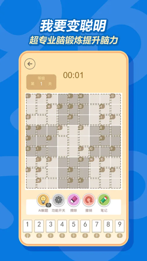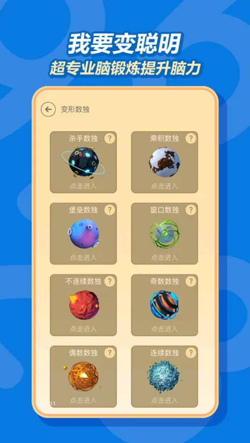 这是一个超全方位的数独游戏,囊括上万关分难度的关卡,上千关不同类型的变形数独,杀手数独、连续数独等等,还有独创的汉字数独、候选数数独,应有尽有;