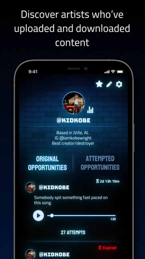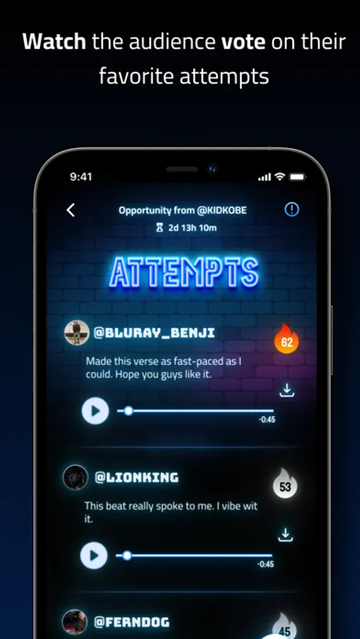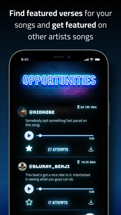 Find featured verses for your songs by cutting out a 30-90 second instrumental of one of your beats. Let other artists download that snippet and upload their Attempt. All users on the app, both artists and listeners can vote on their favorite Attempts. Download 1 out of the top 3 Attempts to use as the featured verse on your song.