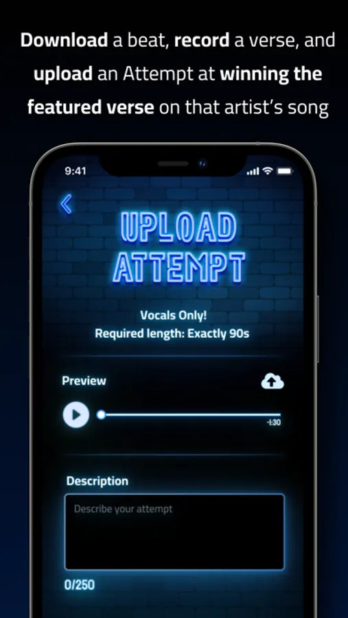 Compete to win the featured verse on other artist's songs by downloading their instrumental, recording your vocals over it, and uploading your vocals as an Attempt.