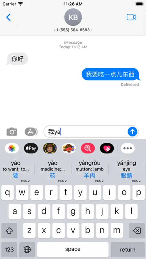 This app provides a keyboard for learners of Chinese. Type the first few letters of a Chinese word in Pinyin and see possible matches with the full pinyin word, the Chinese characters (Hanzi) and an English translation to help you chose the right word.