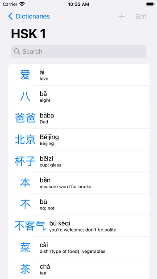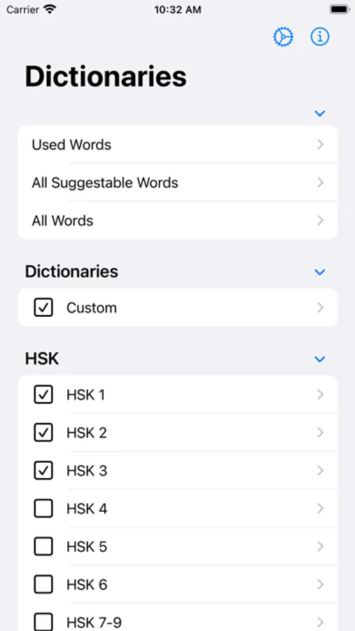 In the Pinyin Pengyou app you can select from a list of dictionaries up to a level which matches the words you have learnt. HSK levels 1 to 6 (and beyond). TOCFL levels 1 to 4. Pimsleur Mandarin up to level III. You may also add additional custom words and phrases with translations of your own. A dictionary of country names is also provided. The main screen of the app provides access to the word lists for each dictionary. All Suggestible words list only the words in the selected dictionaries. All Words list every word in every dictionary.
