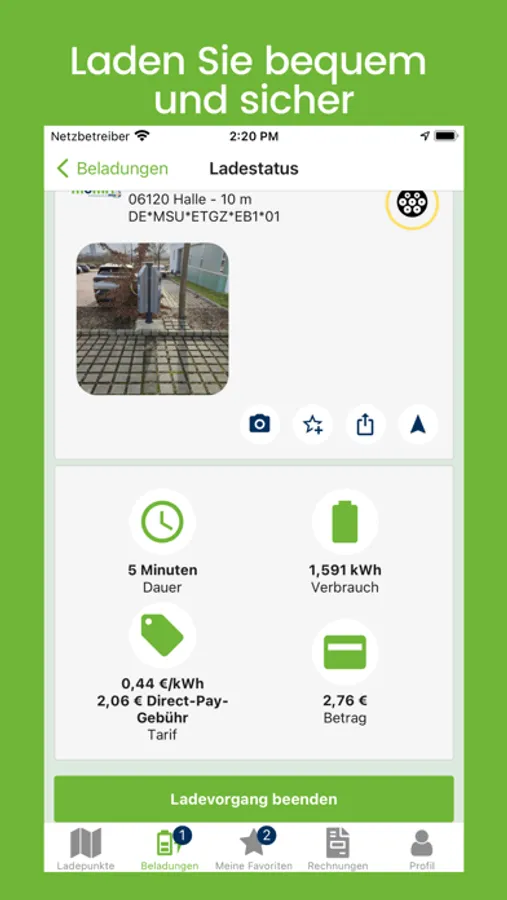Durch Scannen des QR-Codes oder über die App können Sie die Ladung ganz einfach starten und in Realtime verfolgen. Ein Knopfdruck und der Ladevorgang wird beendet.