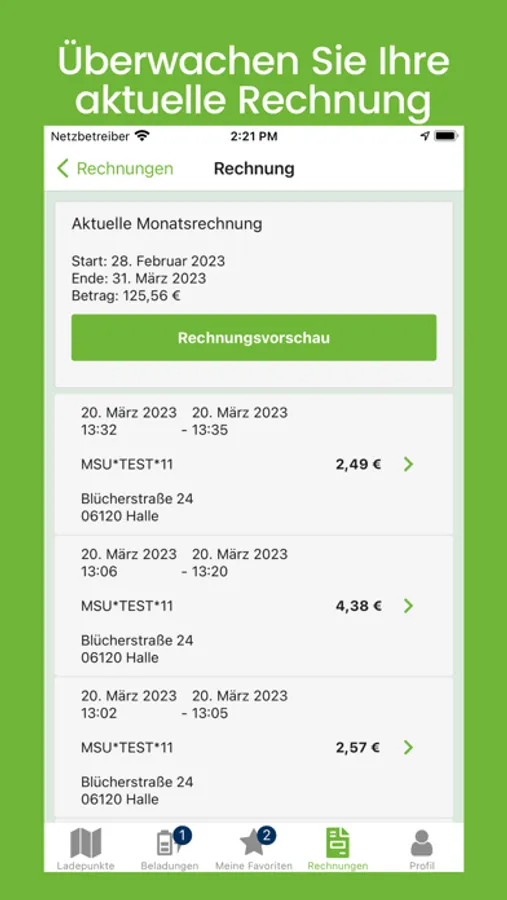 Sie können ihre Rechnungen und Transaktionsgeschichte auf einem Blick sehen. So können Sie jeder Zeit transparent Ihre Kosten im Auge behalten.