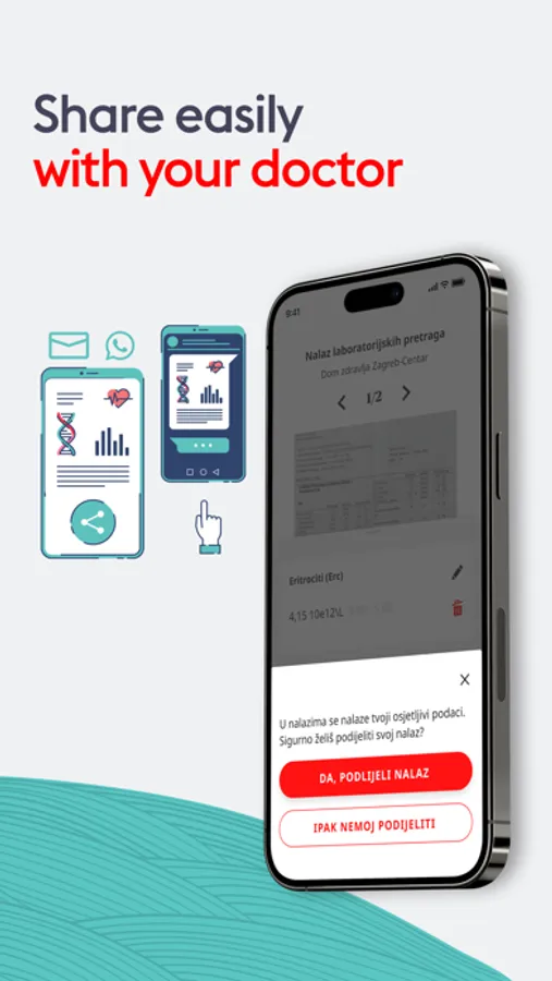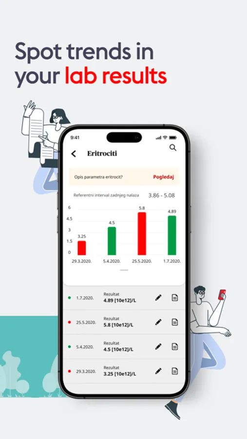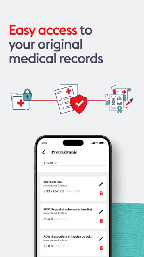 Scan any printed medical record using your phone camera or upload pictures or files from your mobile device. The app will read and recognize the scanned data from your records and store it alongside the original image. Entered data can be quickly reviewed and edited by adding medical institution, physician’s name, diagnoses, or lab test results. Recognized laboratory components are stored alongside reference ranges and visualized as easy-to-use graphs showing value discrepancies.