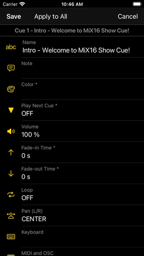 MiX16 Show Cue Lite is limited to 30 cues. No projects. For simple shows or try before buy MiX16 Show Cue paid version.