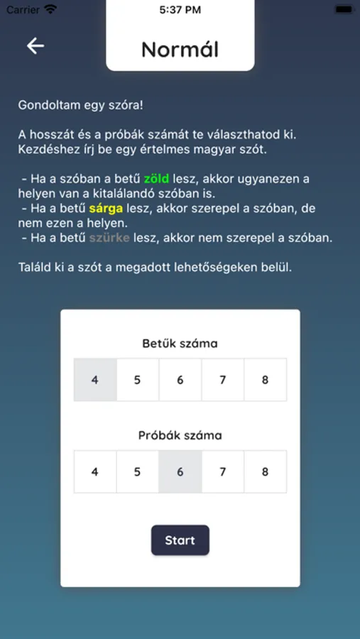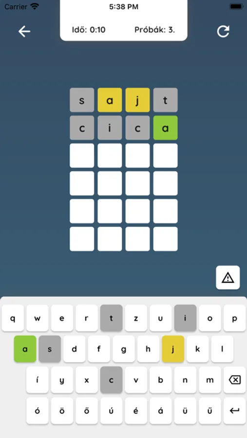 - Ha a betű sárga lesz, akkor szerepel a szóban, de nem ezen a helyen.