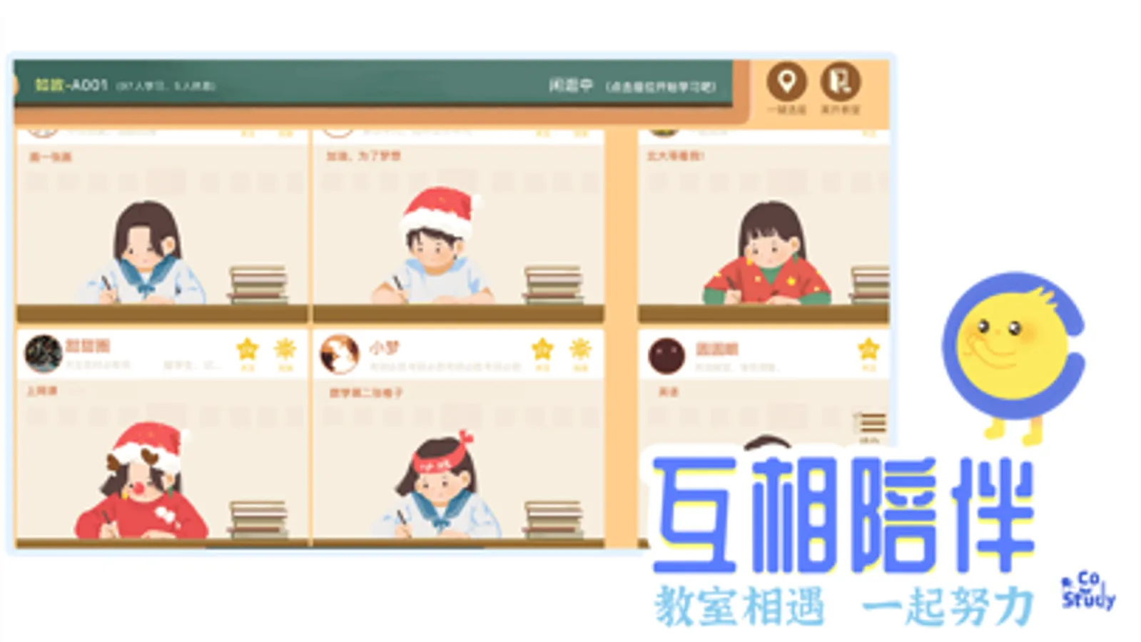 CoStudy线上自习室希望打造出陪伴学习的感觉,让你回到学生时代,回到曾经的教室中。虽然你和虚拟教室里的人物理距离可能很远,但你可以感知到他就是你的同桌、前后桌,或者就与你隔了一个过道。学习的路途并不孤单,有人跟你一起前行。