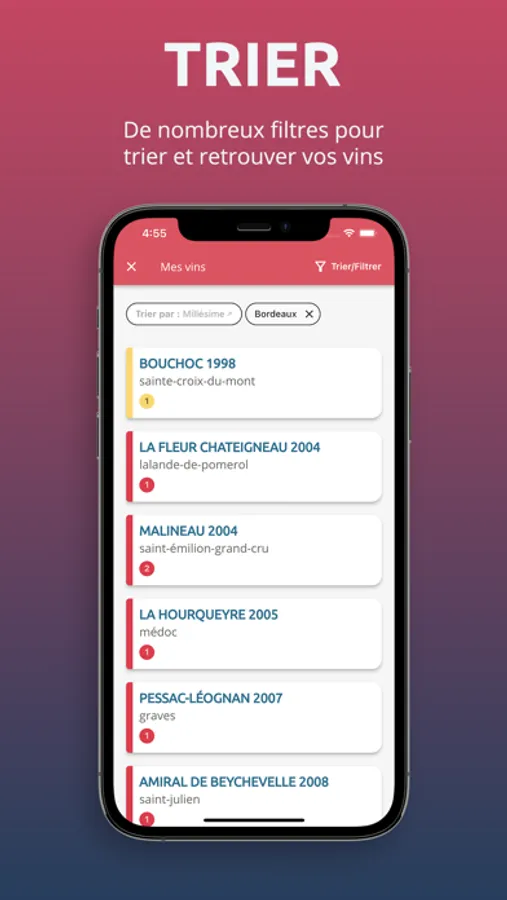 Vous cherchez une bouteille de montagne-saint-émilion prête à boire ? Avec notre puissant moteur de recherche et nos nombreux filtres, retrouvez-la en un instant. Finis les problèmes de bouteilles perdues ou oubliées !