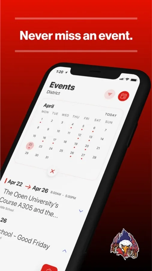 The event section shows a list of events throughout the district. Users can add an event to their calendar to share the event with friends and family with one tap.