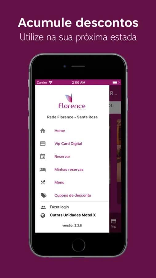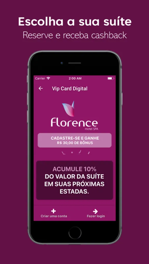 Baixe nosso aplicativo, faça seu cadastro e ganhe um crédito para utilizar na sua primeira reserva. Ir aos motéis da Rede Florense Motel Spa nunca foi tão fácil. Você reserva a sua suíte antes de sair de casa, do trabalho ou da balada, acumula descontos para utilizar na sua próxima estadia e muito mais.