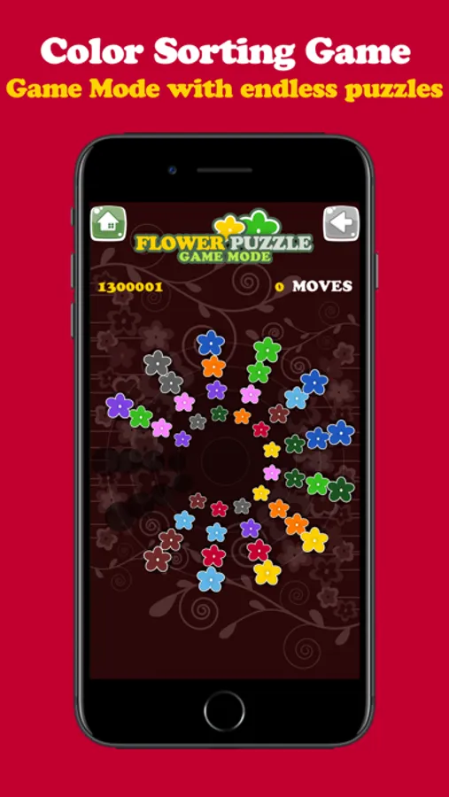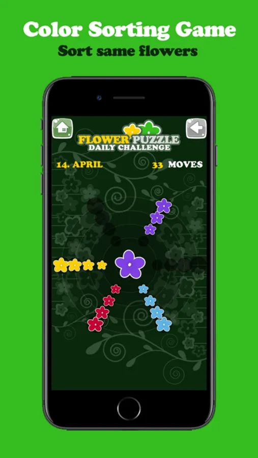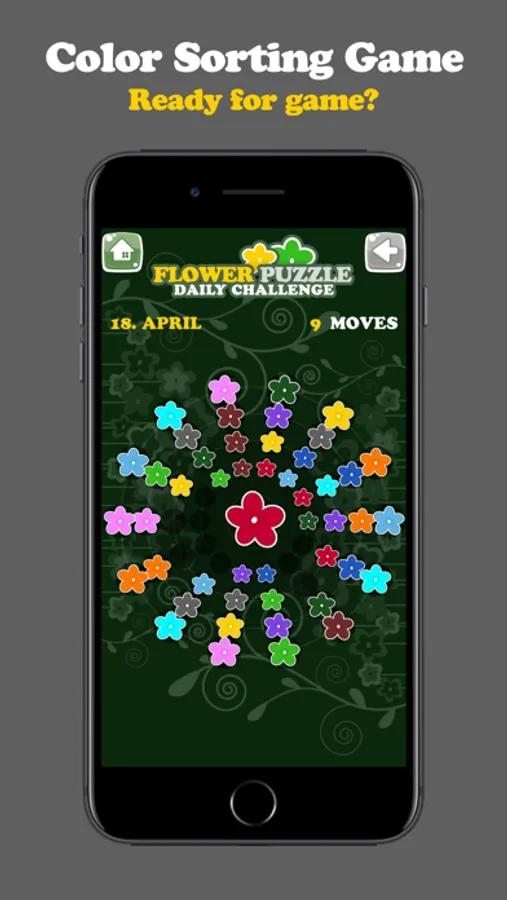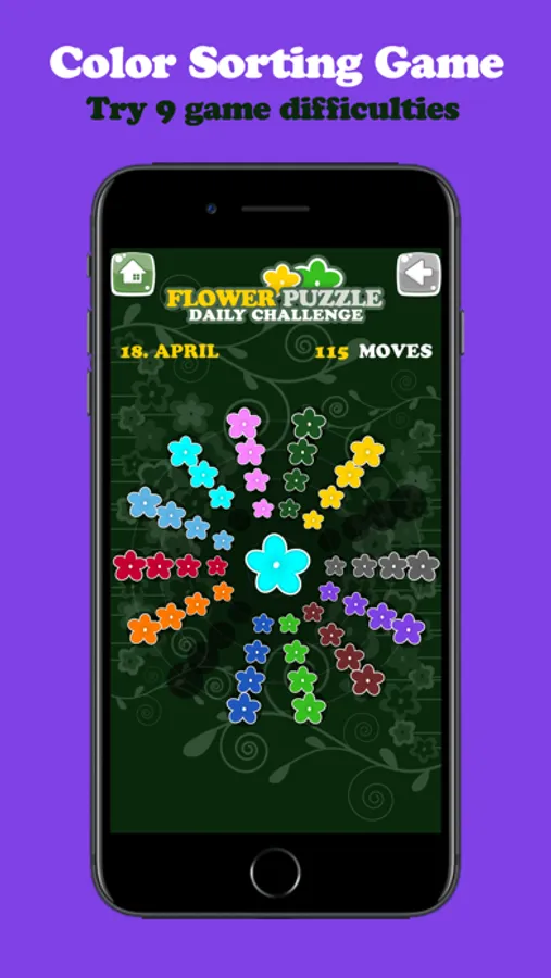 The aim of the game is to sort the flowers according to the individual colours of the corresponding columns. There are 2 empty columns. You have to sort the individual colours together (blue to blue, green to green, etc.) If you sort all the colours correctly - that means 4 flowers of the same colour in one column, the game ends and you get final score.