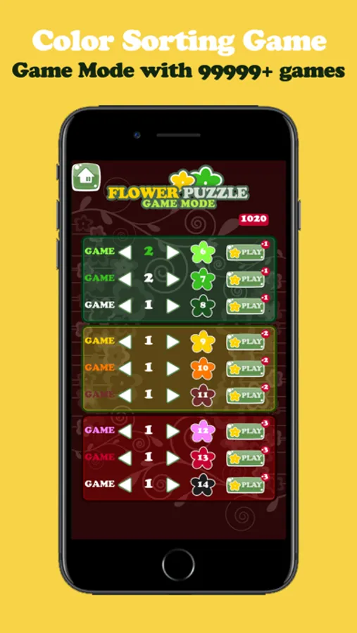 There are 9 variations of the game. Level 6-14 according to the number of colours you have to sort.