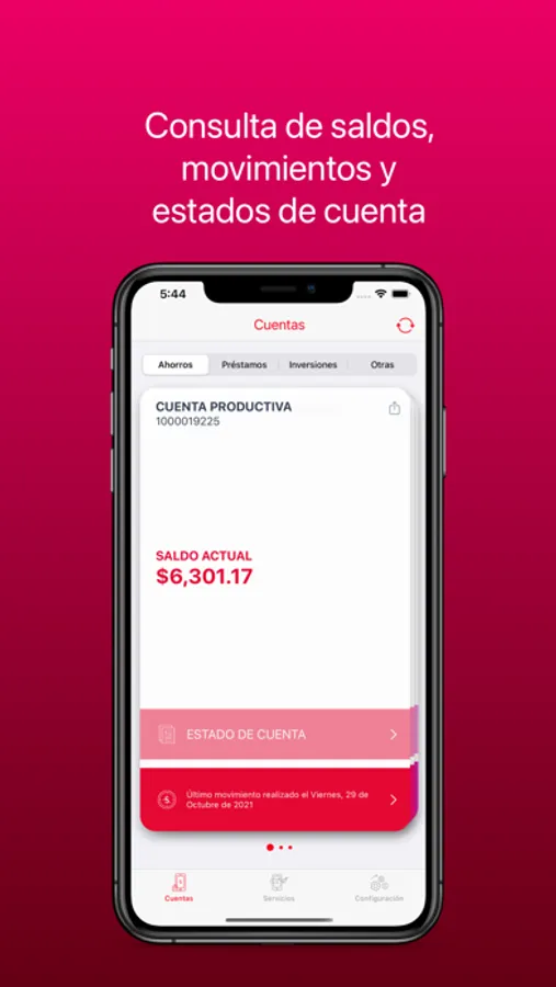 Accede a la información de todas tus cuentas de ahorro, crédito e inversión, revisa vencimientos de tus plazos fijos, tu saldo en ahorros, fecha y monto de próximo pago y más.