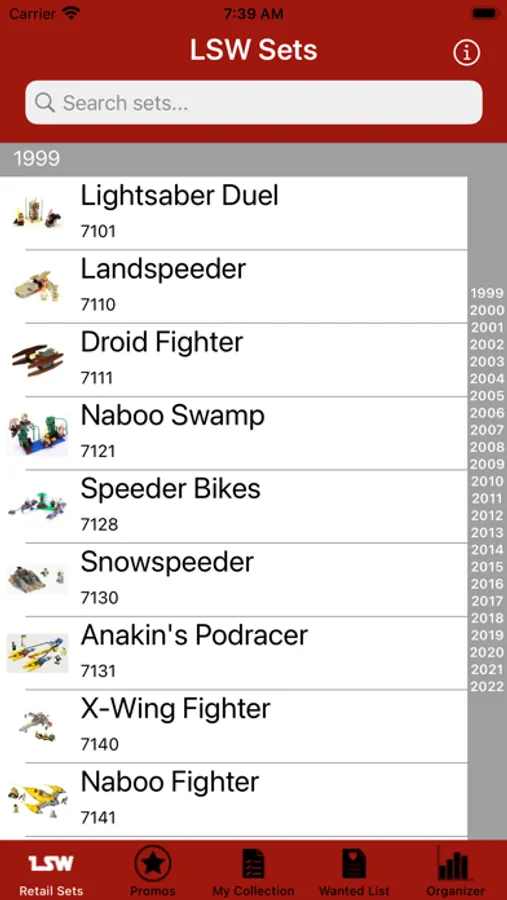 LSW Sets is the next app in the series! LSW Sets is a detailed and user-friendly LEGO Star Wars collecting app and is the perfect way to catalogue your set collection! Use the search bar to quickly find your sets by set number, name, or year. You can swipe between set entries to easily update your collection! The set pages have a neat, simple appearance to provide all the relevant information you need to know. Entries for all sets made from 1999 to current are included and are added in real time which means you don't have to wait for an update to check them off.