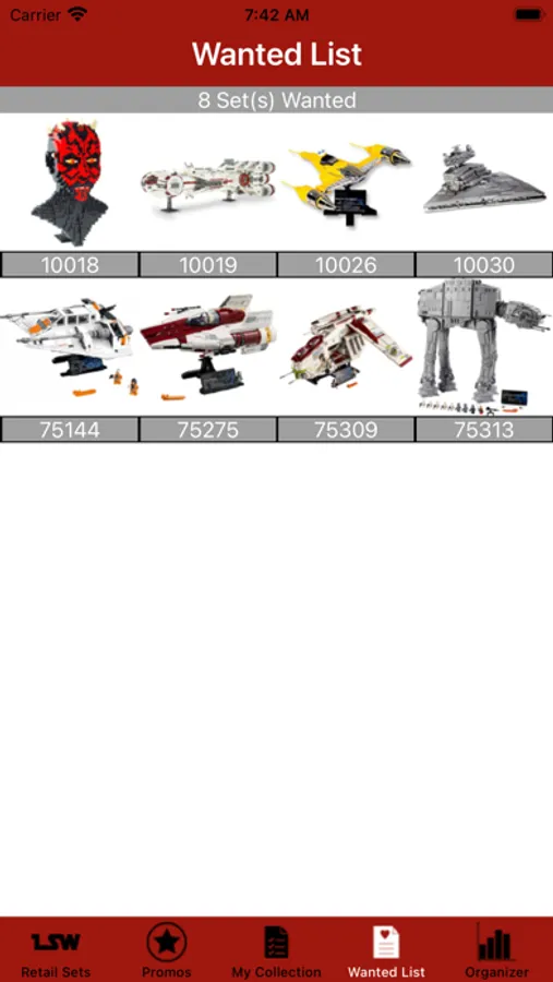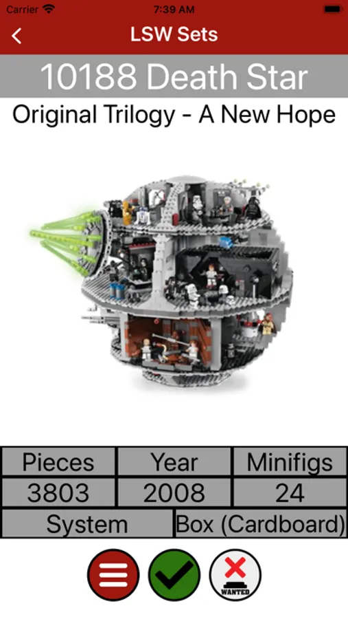 Each entry contains all of the important information about the set including product image, piece count, number of minifigs, and year of release. Just like LSW Collector does for minifigs, LSW Sets allows you to 'check off' sets you already have and add the ones you don't to your wanted list. The green check mark allows you to easily see which sets you already have from the main view while the 'WANTED' symbol indicates which sets you are still chasing.