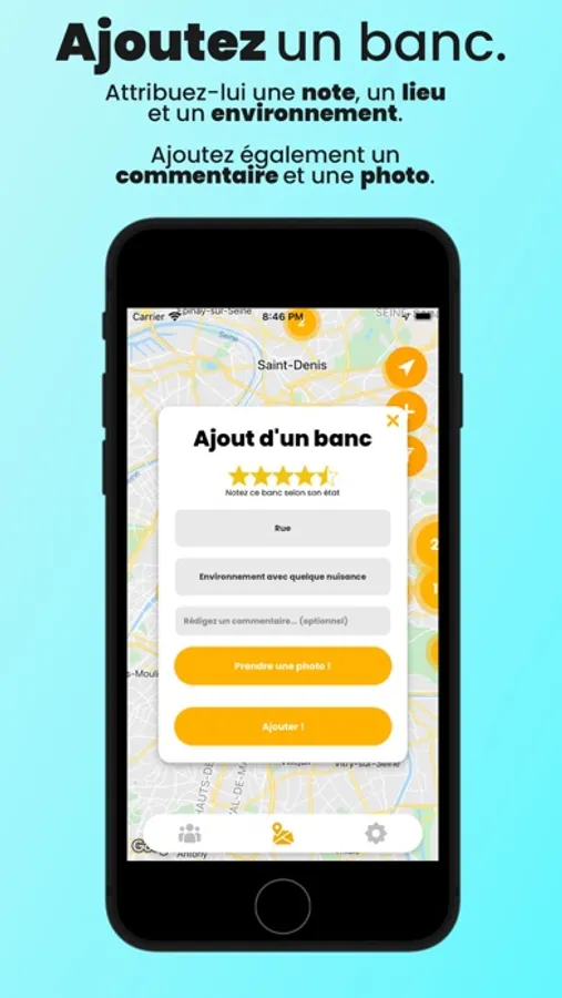 Vous pouvez noter, prendre une photo du banc ainsi qu'indiquer le lieu et le type d'environnement dans lequel il se trouve.