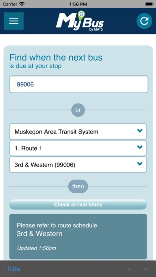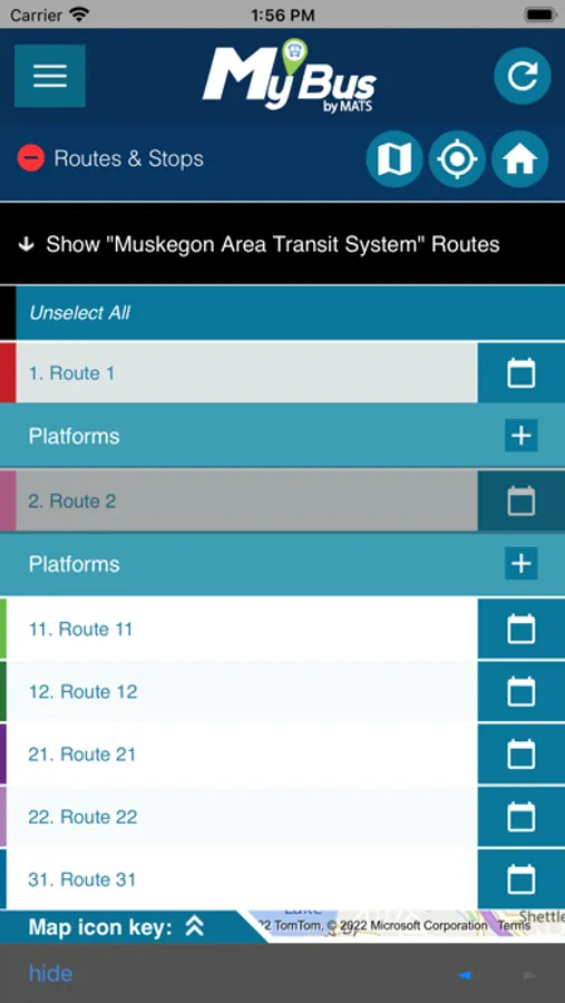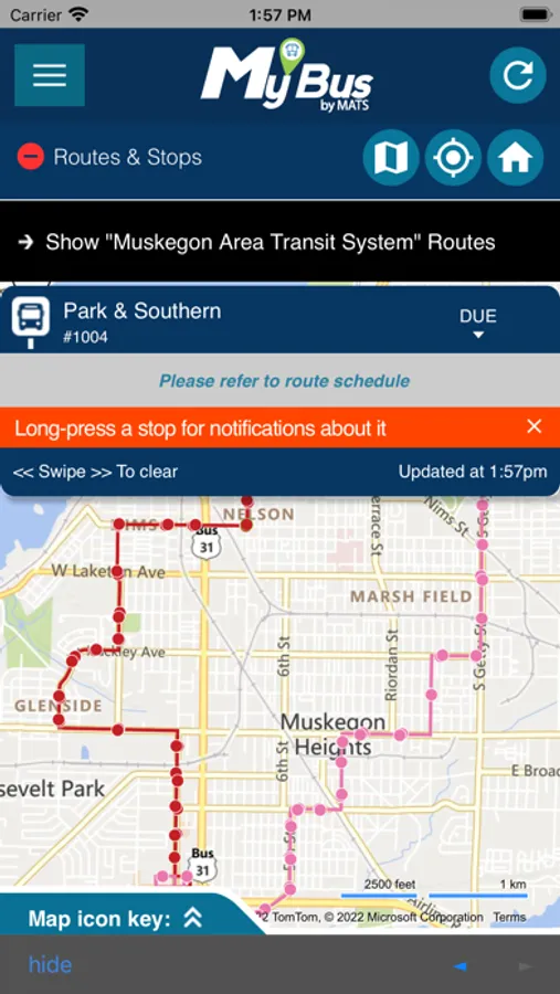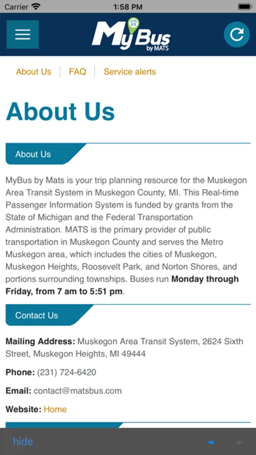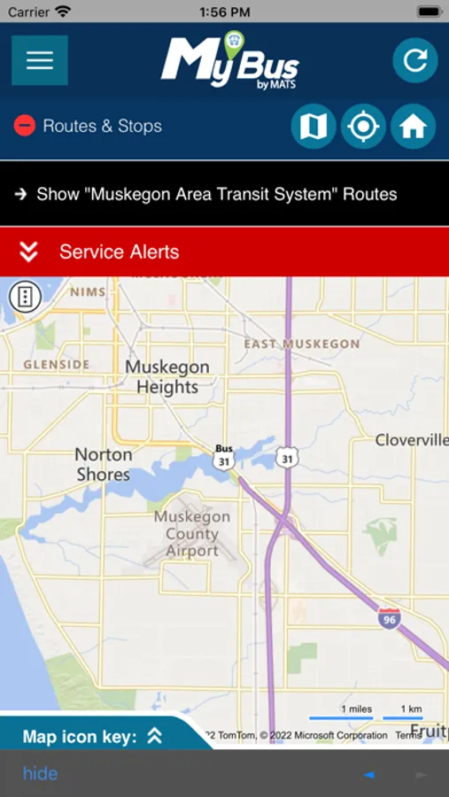 Find the nearest bus stop to your current location (requires GPS/ location services to be enabled on your device), view an ETA for your bus and view its current position. Save your favourite stops and routes, and access bus schedules. Muskegon Area Transit bus service.