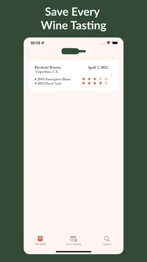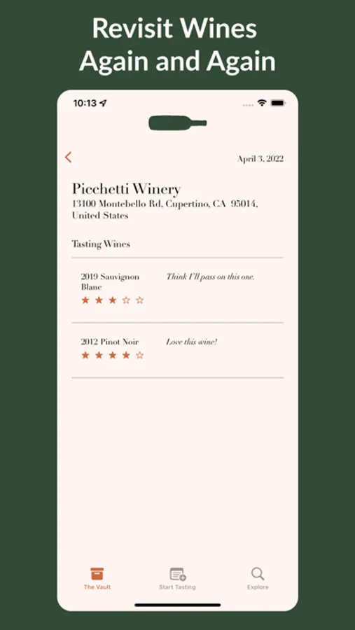 Step into "The Vault," where your past tasting notes come alive. Immerse yourself in the nostalgia of previous tastings, as wineries and wines are beautifully summarized, accompanied by their star ratings. Easily navigate through your personal wine archive, organized by winery name, and relish the memories of each tasting. Discover the joy of browsing the date of each tasting and let the stories behind the wines unfold.