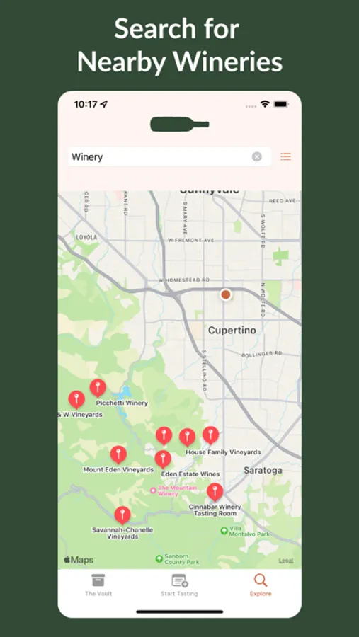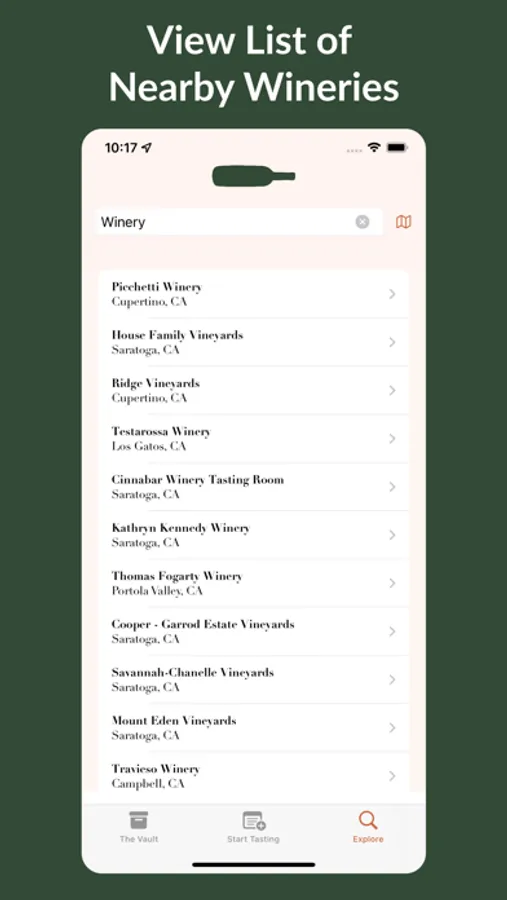 Unleash your thirst for discovery with the "Explore" tab. Enabled with location services, Tasting Vault unveils a dynamic map showcasing nearby wineries. Simply search for "winery," "winery near me," or the name of a specific winery, and watch the map populate with captivating options. Plan your next tasting adventure with visual precision. Prefer a list view? Just tap the list view button and behold a comprehensive list of nearby wineries at your fingertips.
