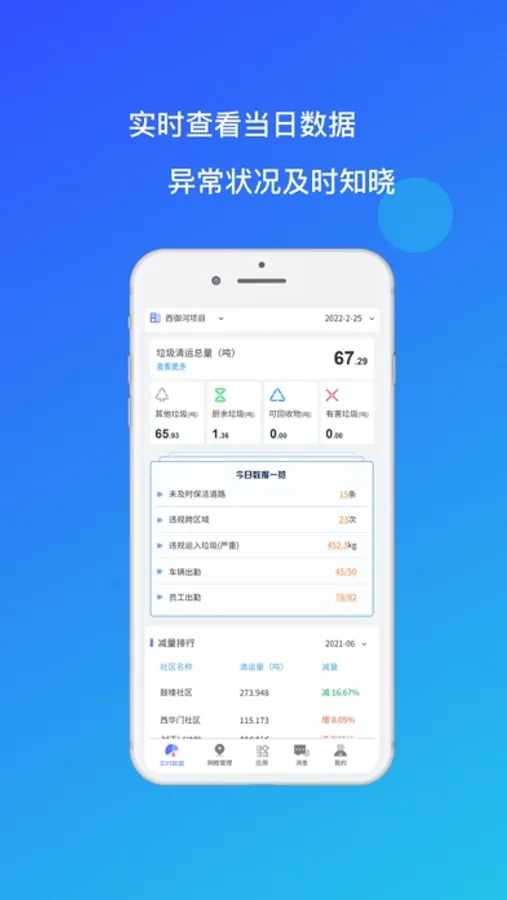 摆脱环卫项目人盯人的管理模式,将项目管理进行移动化。提供准确、及时的数据。记录项目运营中人员、车辆、垃圾清运、道路保洁等正常、异常事件。