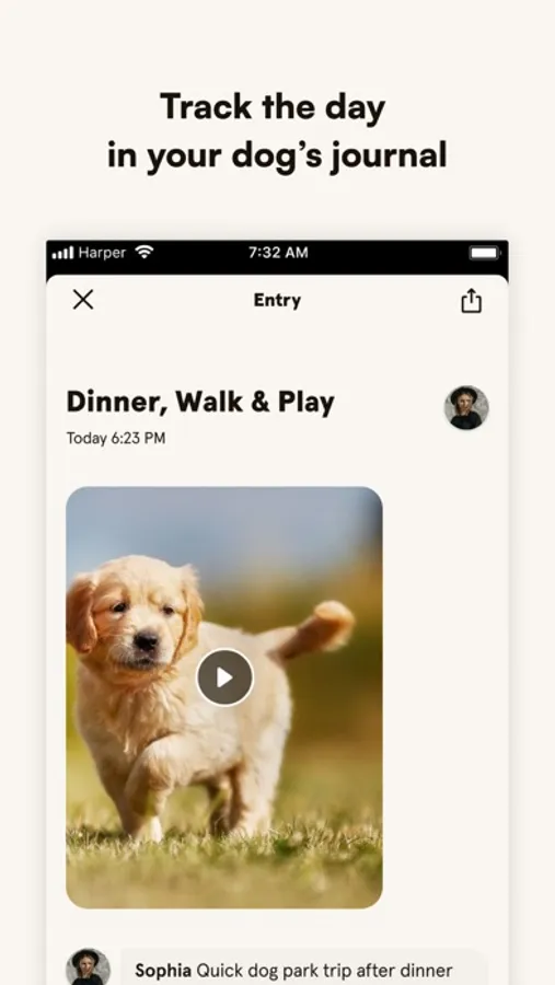 → Easily track the day in your dog’s journal. It’s effortless to log and save moments in your dog’s life, big or small with photo and video.