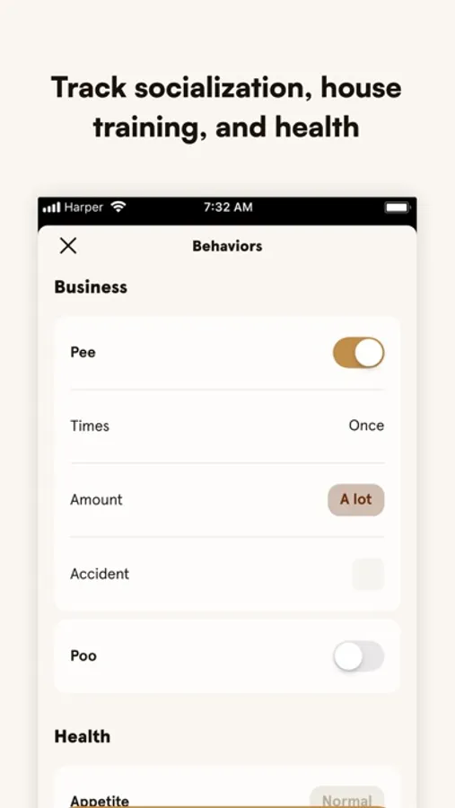 → Track socialization, house training, health, and more. It’s easy to monitor their progress, how they’re feeling, and adjustments you might want to make.