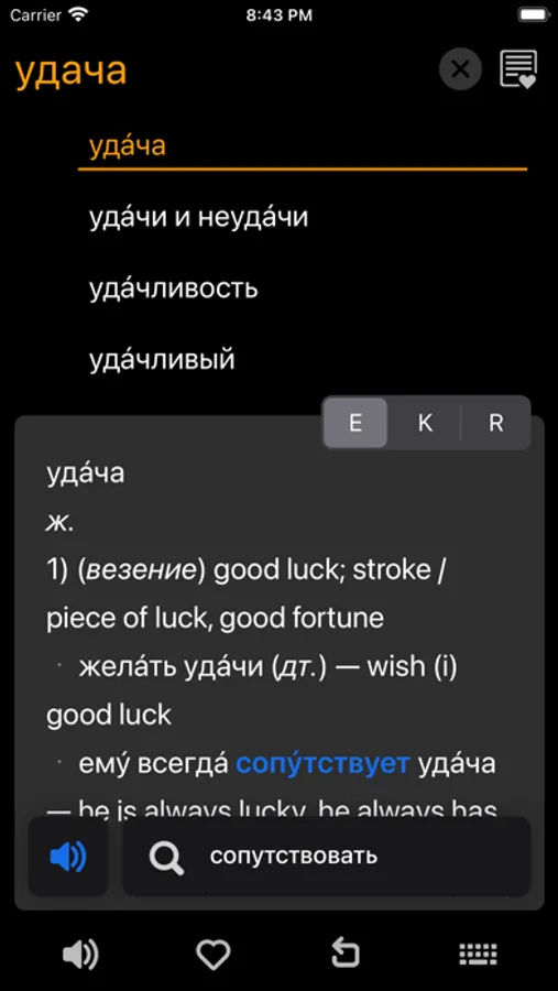 Congratulations! Your quest for the best multilingual dictionary is now over. Enjoy access to 18 offline dictionaries for three languages — Korean, English, and Russian — beautifully united in a single easy-to-use app. KoRuEn Dic’s unique interface offers a set of powerful features. Everything you need — pronunciation, search suggestions, hyperlinked content, bookmarks, and flashcards.