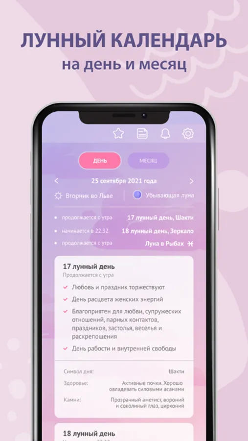 Установите напоминания о практике, лунных днях, задайте индивидуальные настройки, чтобы получать уведомления.