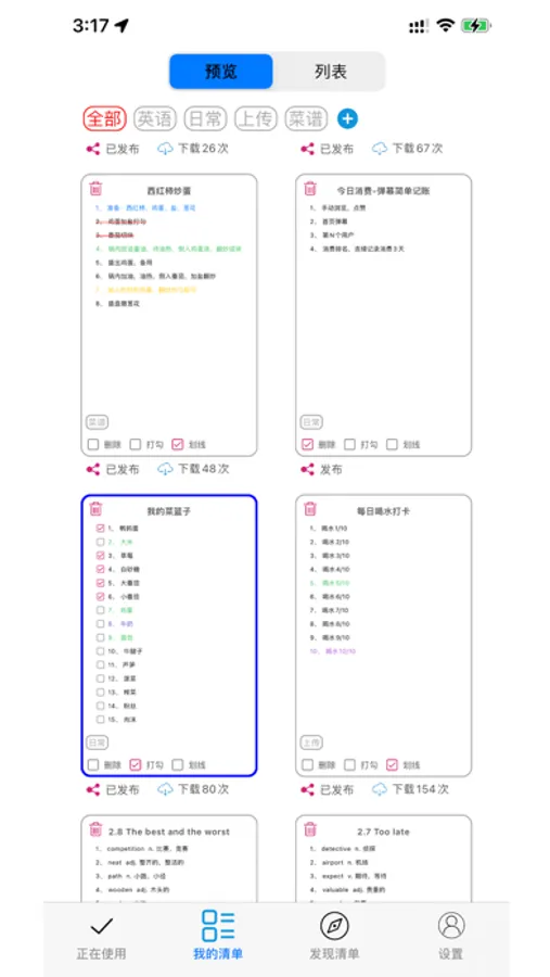 预览:显示清单预览内容,简单直观,一键选择。在这里可以设置清单的标签,模式(删除、打勾和划线模式)
