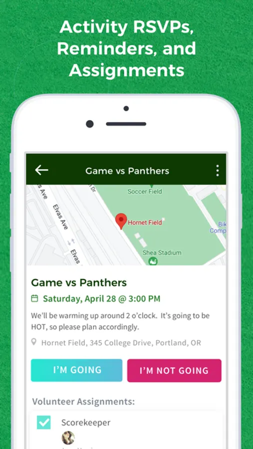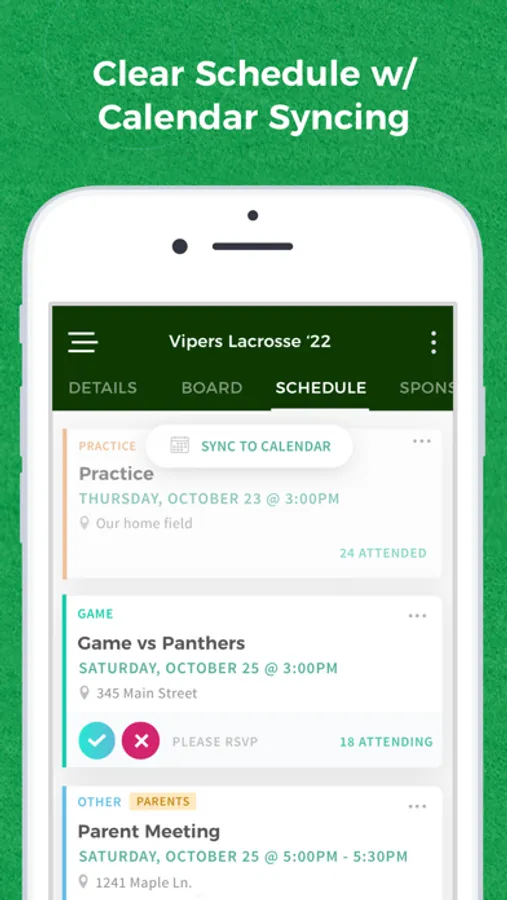 Load in your games and practices, and collect RSVPs for each. We'll send automatic reminders to the players and parents to make sure you always know who's planning on showing up. Users can also sync the team calendar to their own personal calendars!