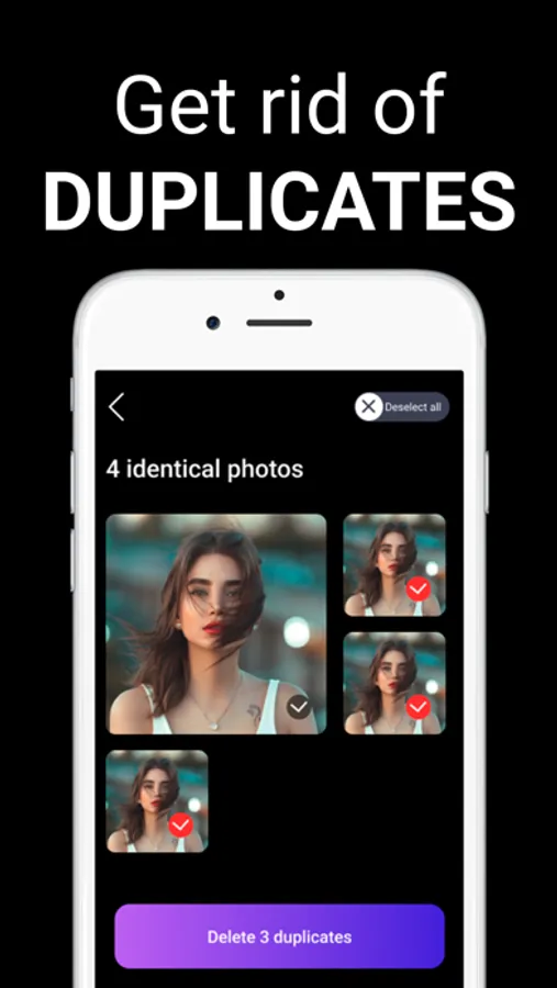 You may have uploaded the same photos and taken the same screenshots to your gallery over and over. Thanks to its powerful features, our app detects all these duplicate photos and screenshots and then shows them to you. It will not delete these photos and screenshots without asking you if you want to delete them.