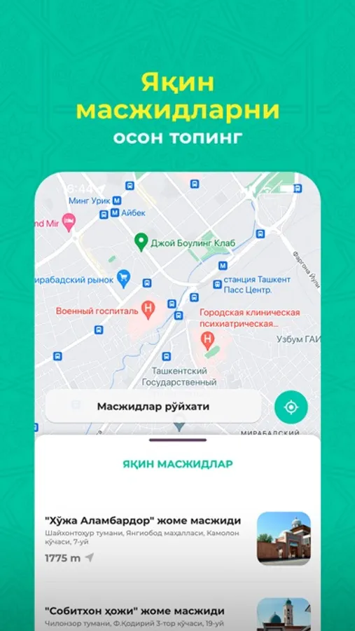 Масжидларнинг намоз вақтларини ва харитада жойлашувини кўринг
