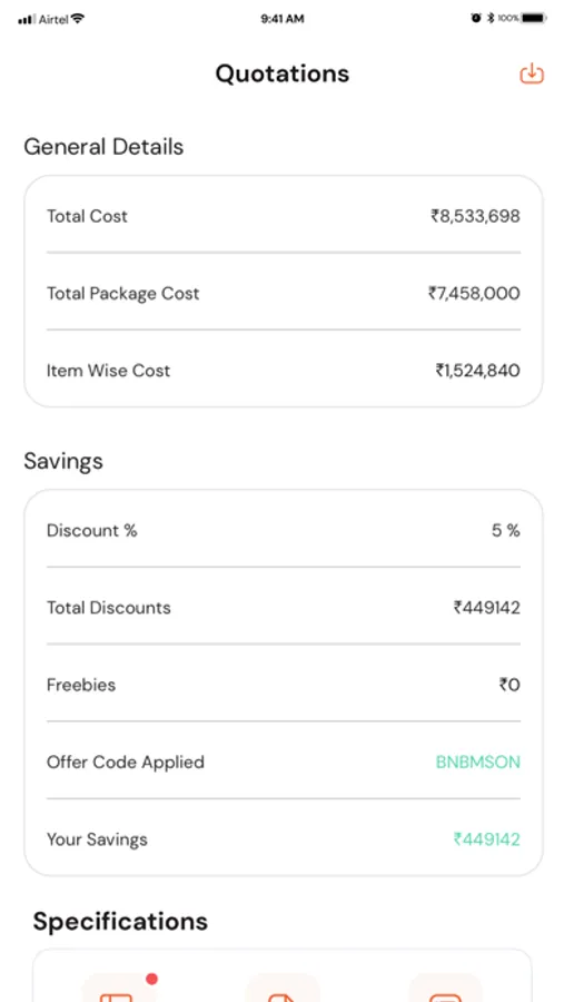 3. Contract & Specifications: View construction package cost, material costs, etc. at one place. Download the contract to study each specification in detail.