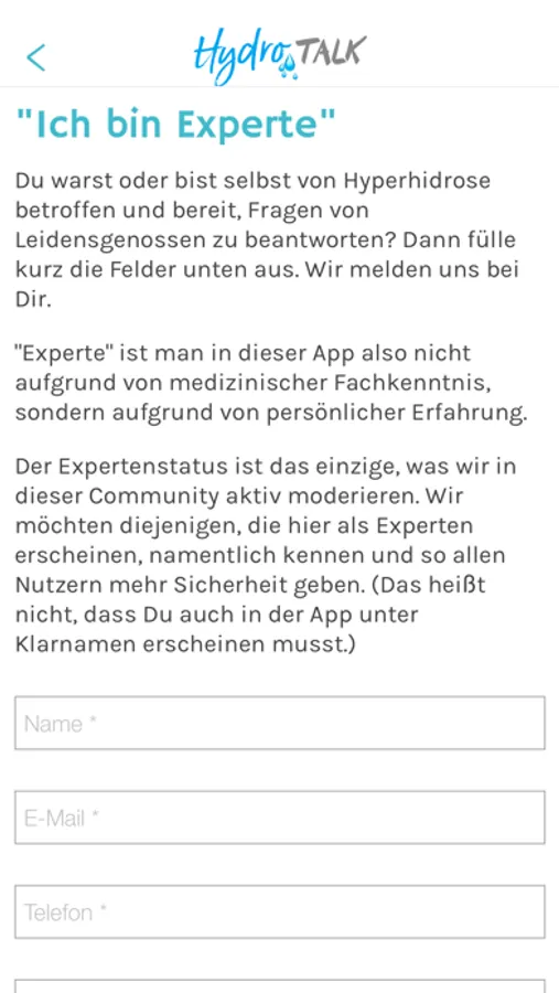 In dieser App kannst Du Dich mit anderen Hyperhidrosebetroffenen und vor allem auch mit ehemals Betroffenen austauschen. Sie richtet sich an Menschen, die Fragen stellen wollen - entweder ganz privat im 1:1-Chat oder öffentlich für alle anderen Nutzer sichtbar - und an solche, die bereit sind, sie aus eigener Erfahrung heraus zu beantworten. Ein offener und vertrauensvoller Austausch mit Menschen, die dasselbe Problem haben oder hatten und Dich deshalb wirklich verstehen.