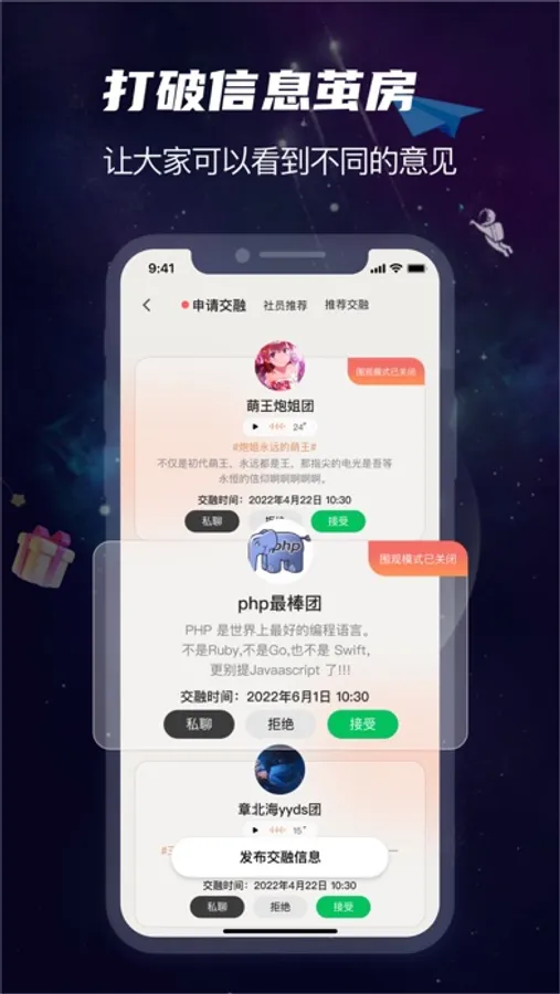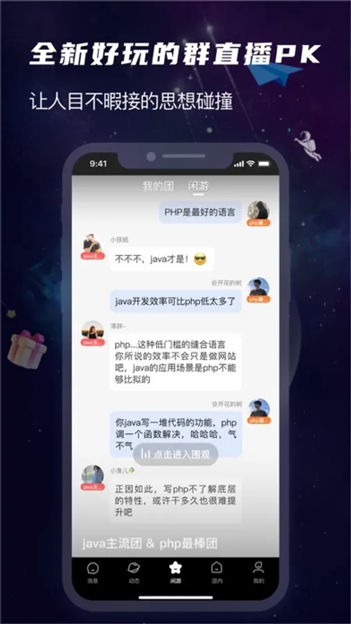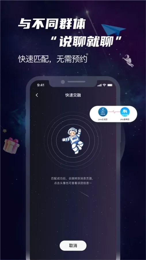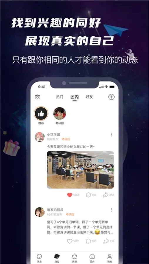 团宇宙是一款以群交友为核心的社群社交APP,致力于让每一个人都能找到让自己放松的圈子,哪怕你喜欢的东西小众,冷门,也可以在团宇宙里找到相应的团,也能玩得很开心。