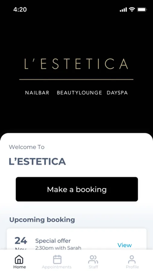 The L’ESTETICA app makes booking your appointments and managing your loyalty points even easier. You're just a few taps away from feeling good and looking great!