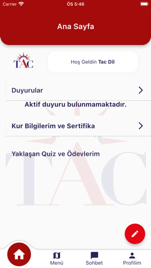 • TAC Dil Kursu mobil uygulamasını kullanarak aynı seviyedeki arkadaşlarınızla sohbet edebilir writing yapabilirsiniz.