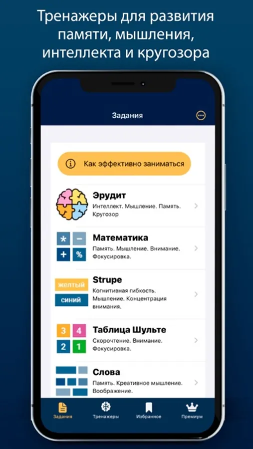 Наше приложение развития памяти и ума состоит из 2-х разделов: