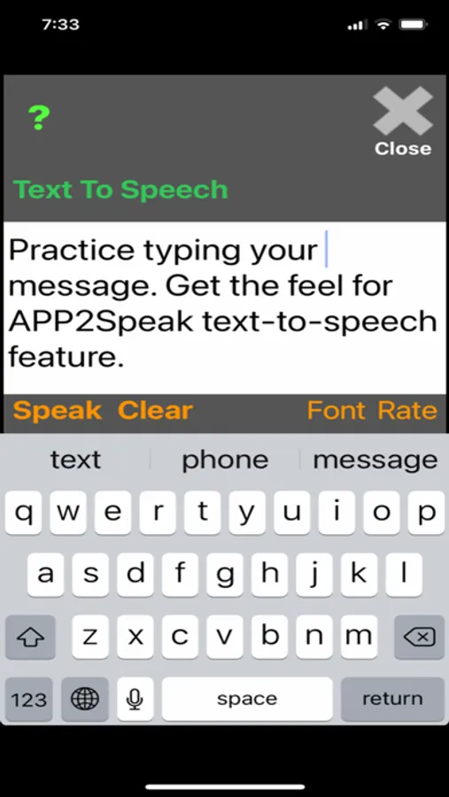Text to Speech – Get the feel for typing your messages. There is no speech/voice output in the APP2Speak Lite version