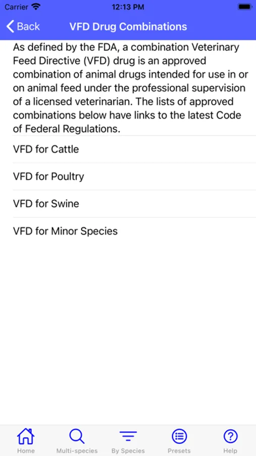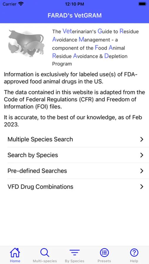 This mobile version was developed at the University of Florida, Gainesville, Florida, USA. It is based on information found in VetGRAM (http://www.farad.org/vetgram), which is one of the information resources provided by the Food Animal Residue Avoidance Databank.