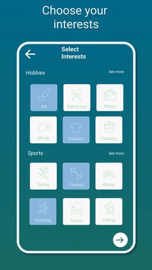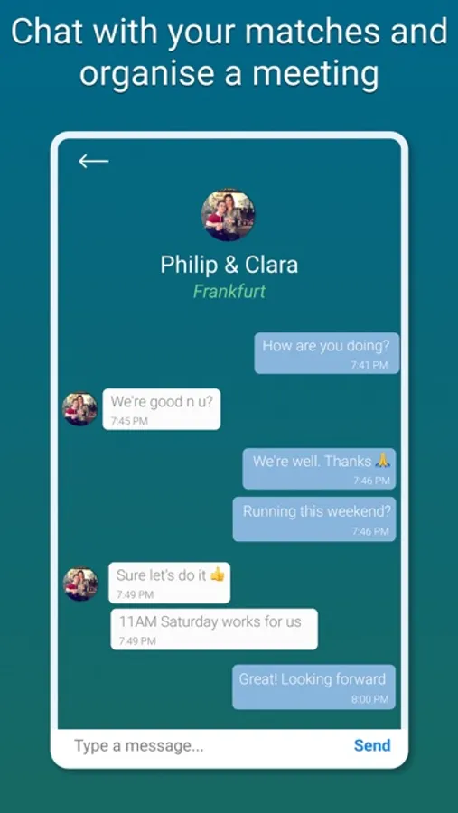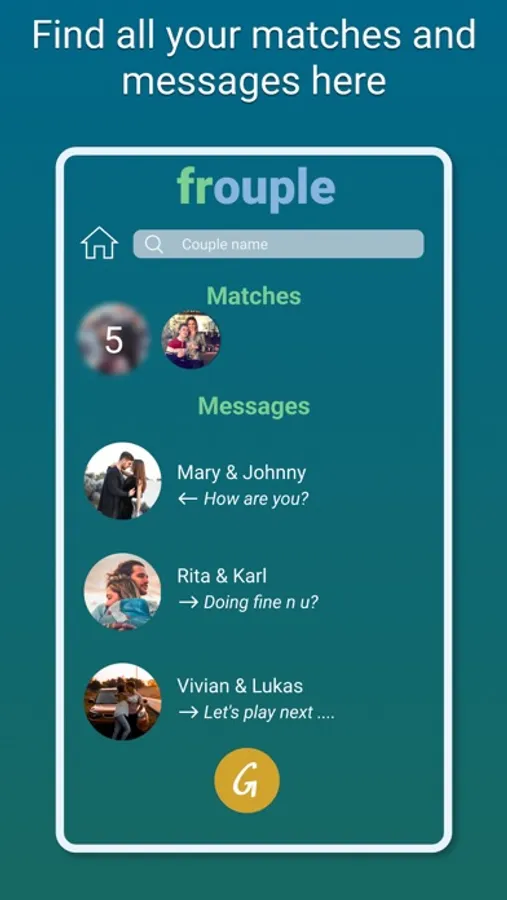 In our app, you create a profile together with your partner and specify your interests and hobbies. Afterwards you can see profiles of other couples who share your interests. If two couples “like” each other there is a match. Now you can text the other couple and arrange to meet for dinner, sports or any other activity of your choice.