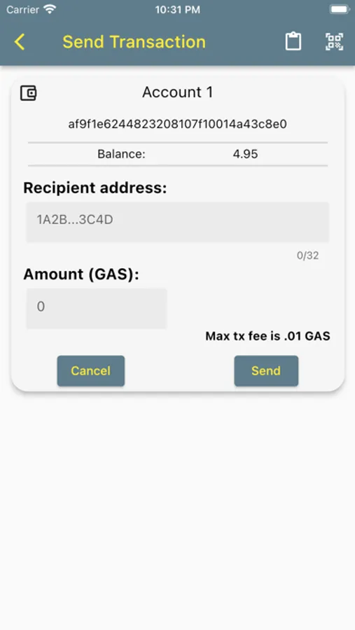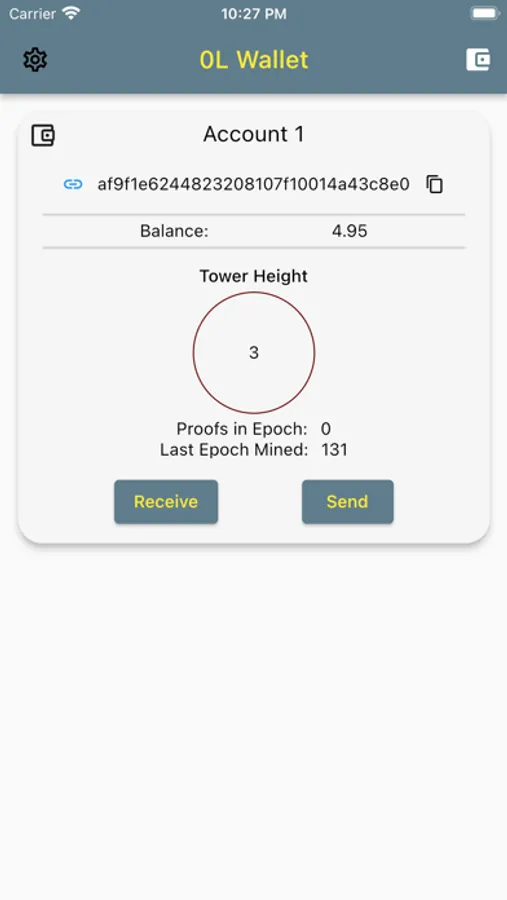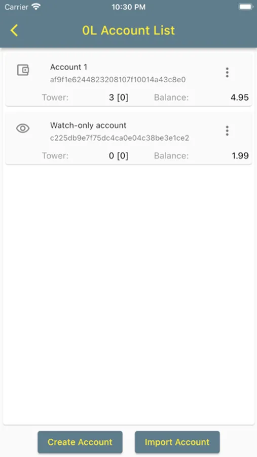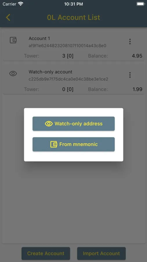 0L network wallet app providing 0L asset holdings and management. A user may import a mnemonic phrase for all features or a public address for view-only features.