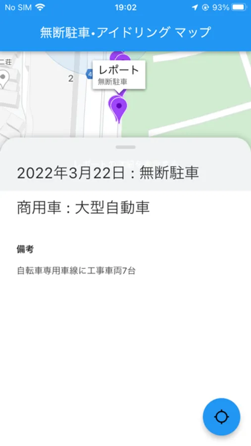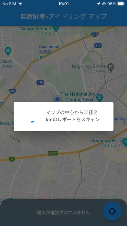 右下のボタンをタップし、マップの中心から半径2km以内のレポートをスキャンします。