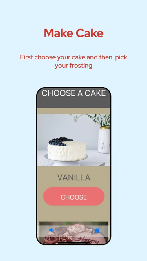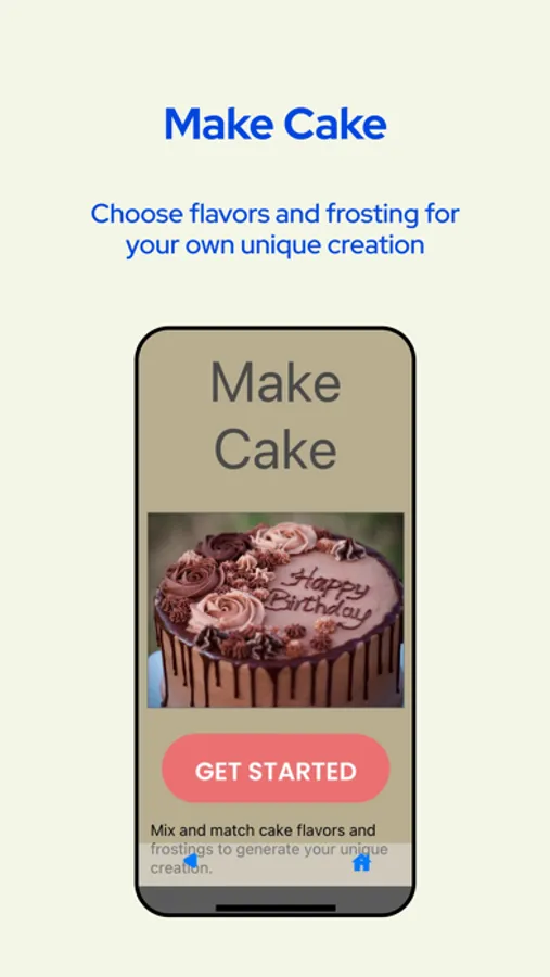 A mix and match cake recipe app that allows for unique recipe combinations. Users can upload images of their decorated cakes and share with other users.
