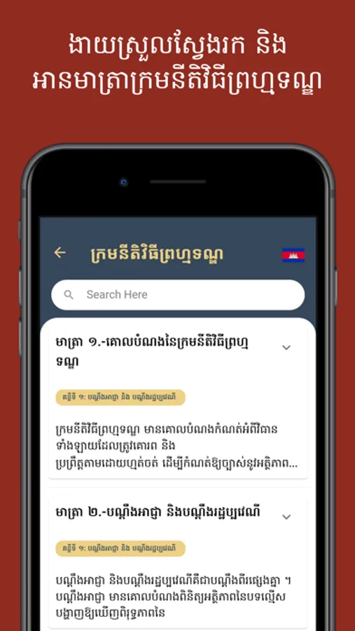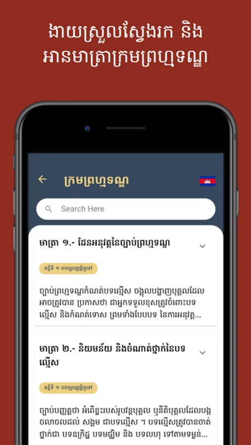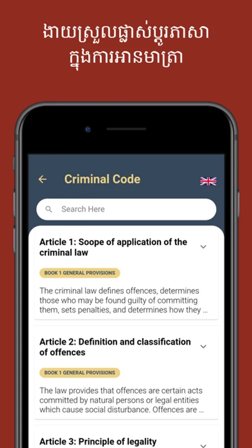 Cambodia Criminal Code App provides search function for user to find any article based on keyword, article, chapter and more.